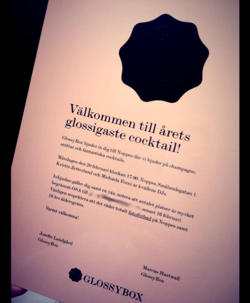 Cocktail eve. 20 feb 2012 av sarahgrundenw Äntligen blir det att träffa kära vänner denna afton!! Kl 17 beger vi oss till Noppes för ett GlossyBox event. Mys pys. Ser fram emot detta! Blir dock champangefritt då det nalkas plåtning tidigt imorgon. Kram på er