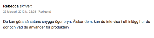 Hejsan Rebecca! Stort tack :-). För ett tag sedan bad jag er läsare att maila bilder på er själva (fokus på bryn) så att jag fick möjlighet att hjälpa er på ett mer personligt plan. Jag är medveten om att alla ej fått svar än och jag ber om ursäkt för detta :-(. Det tar ett tag att hjälpa var och en, jag försöker fortfarande svara på en eller två varje vecka.
