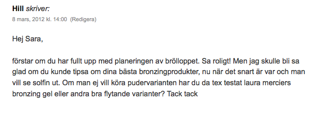 Hej Hill!! Oh gulle dig, tack för omtanken :-).Laura Merciers är jätte bra, dock har jag fått väldans dålig erfarenhet av deras förpackningar under det senaste halvåret då de börjat läcka rejält när jag har flygit… dont ask me why men det har hänt 3 ggr!!! Så om du inte planerar att flyga inom kort så kör på dem ;-). Jag gillar Kanebos Bronzinggel starkt, den är faktiskt min favorit. Innehåller dessutom spf vilket är ett stort plus!! Guerlains är även bra! Kramar