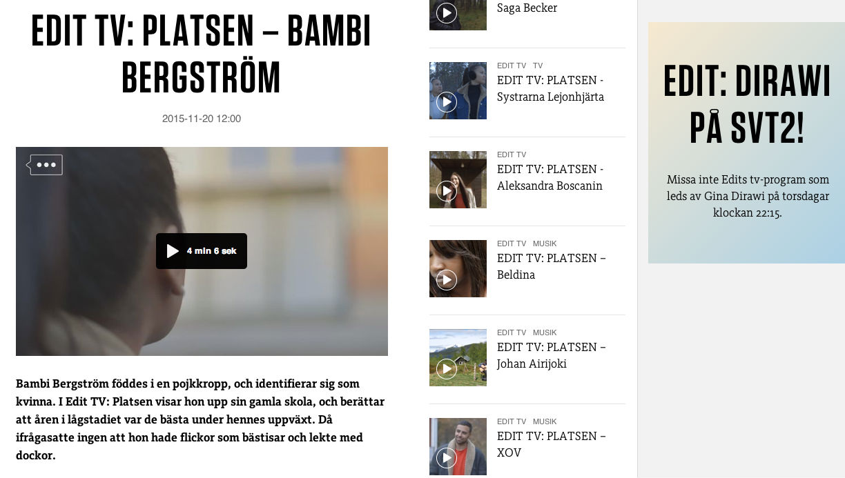 Bambi Bergström föddes i en pojkkropp, och identifierar sig som kvinna. I Edit TV: Platsen visar hon upp sin gamla skola, och berättar att åren i lågstadiet var de bästa under hennes uppväxt. Då ifrågasatte ingen att hon hade flickor som bästisar och lekte med dockor.
