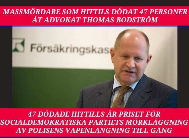 Hittills (18 okt. 2014) har fler än 47 personer dödats med vapen som Socialdemokratiska partiet, Göran Persson, Thomas Bodström, Sten Heckscher, åklagare och poliser i Växjö/Älmhult, samt några dussin andra tjänstemän vid olika myndigheter inom rättsväsendet, hjälpt till att säljas vidare genom att begå grova brott för att kriminella poliser och deras civila infiltratörer inte skall åtalas, då det som Corruptio-journalist sagt sedan 2003 skulle visa sig vara ETTHUNDRA PROCENT SANNING!!!