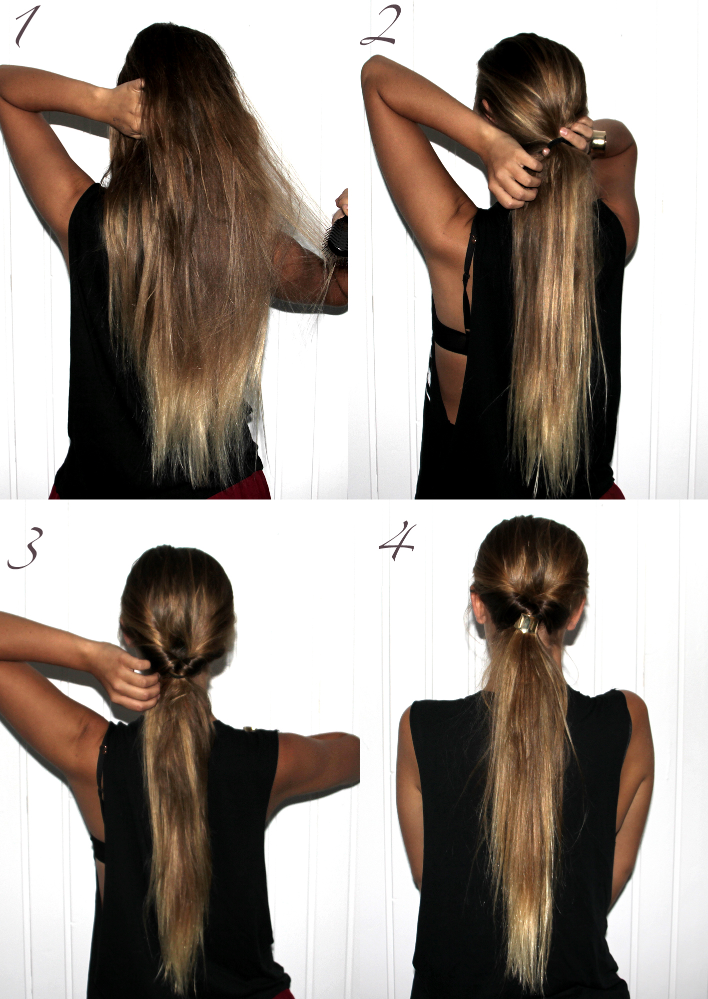 1. Samla håret och sätt upp i en ”rörlig” tofs. (För att få en lite slappare känsla)