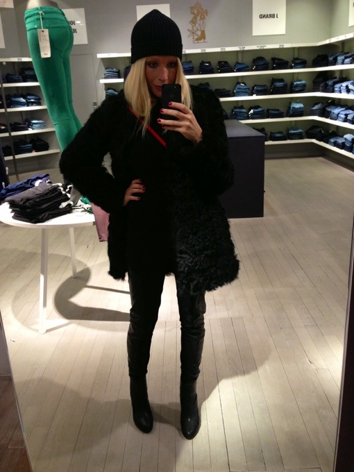 Mössa, Zara. Pälskappa, Mango. Polotröja, COS. Byxor, Acne. Skor, Rag & Bone