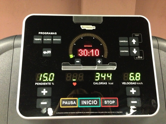 3 min, hastighet 6,8, lutning 15% (här är det okej att hålla i räcket om det blir för tungt)