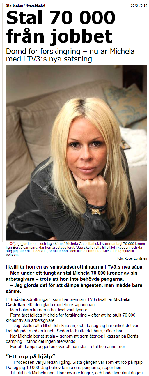 Vi fortsätter litehär på aftonbladet när jag endå är inne nu.. Hittade en annan artikel här och ja,  haha jag dör lite. Alltså det här är ju bara ganska sjukt tycker jag. Man gör en dum grej man straffas INTE utan man hamnar helt enkelt i tv!? Haha helt stört om du frågar mig.  70 tusen stjäl man bara så? Och det absolut värsta av allt bruden behövde inte cashen? Ok om hon hade problem och skuldsatt och såg en väg ut eller något liknande. Då hade man gått på sympati men nu. Alltså det är juh bara sjukt, ”uppmärksamhet” behövde alltså tjejen..  Ah nej, det finns verkligen människor för exakt allt.
