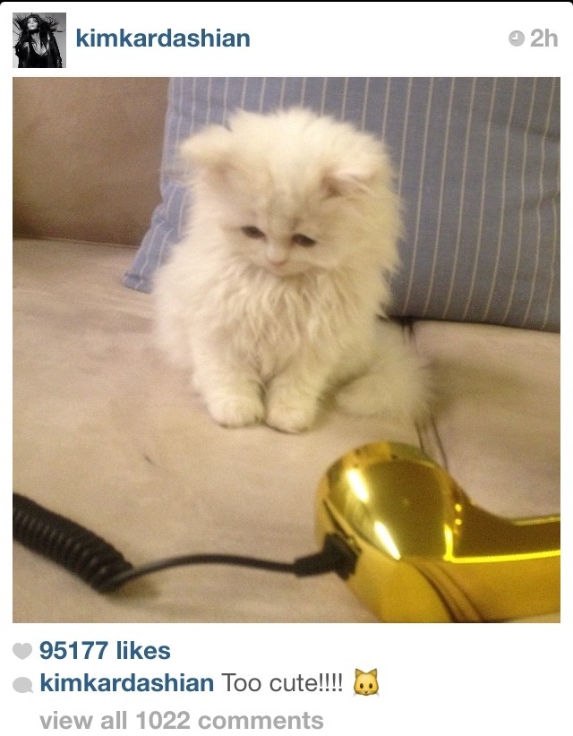 Jag följer Kim kardashian på instagram. Som alla andra ungefär 🙂 ibland är det kul ibland är det omg men oftast är det OOOMG vill käka upp hennes katt. Ser du hur söt den är helt sjukt! Dock läst att hon bär runt på den överallt i bur. Men man ska inte tro allt man läser. Later!