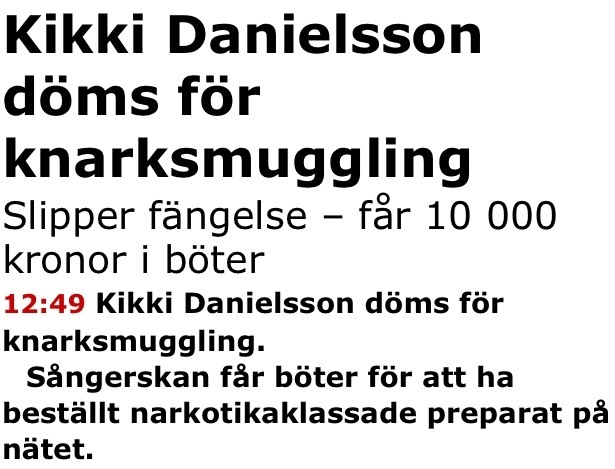 Kikki Danielsson som stått i rampljuset länge haha alltså! Kolla in hon slipper fängelse för att hon smuggla knark! Haha hade det varit en blatte hade han fått sluten anstalt ungefär! Nepp 10 tusen i böter. Jaja. Det här systemet är ju fucked. Later!