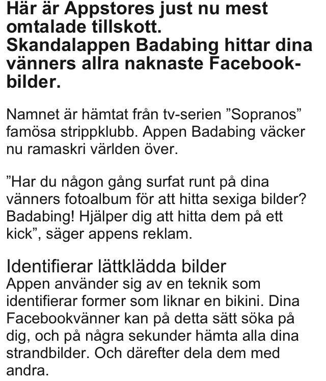 Det vi pratar om här är ju badabing! Hört talas om den? Ofc du är ju medlem. Uchdå så hemskt tänk er för. Undrar hur många bikininilder där finns på folk. Ja det är endå inget märkvärdigt man ska vell ha något på sig när man badar vafan! Kan folk sluta göra allt tabu. Men den här appen är ju Sjukt onödig faktiskt. Varför man ens gjorde den. Lite stalker varning på den faktiskt !! Later!