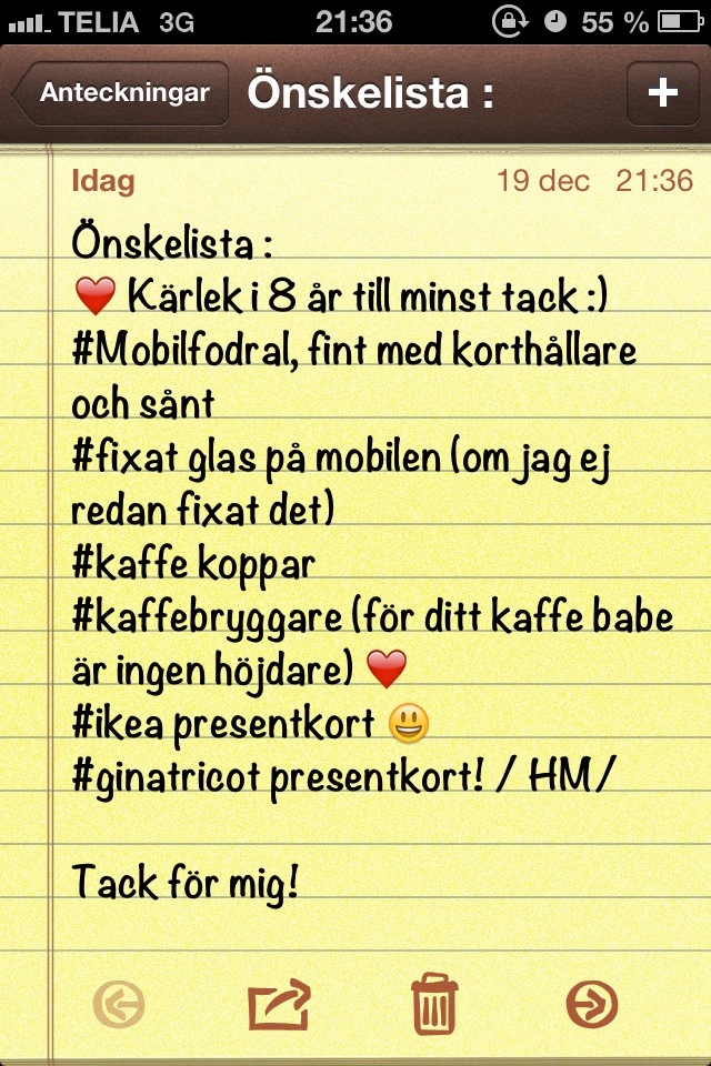 Miiiin önskelista måste man ju få dela med sig. Den här skrev jag till j! sen som du ser! Och lite smörande där på slutet till min boytoy hihi! Ju mer man smörar kanske han köper allt :D!!