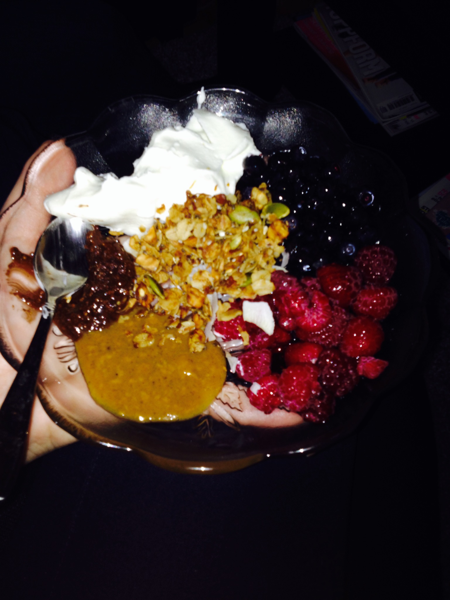 Sen efterrätten blev bär med turkisk yoghurt och nötsmör o hemma gjord kolasås , drömmen!