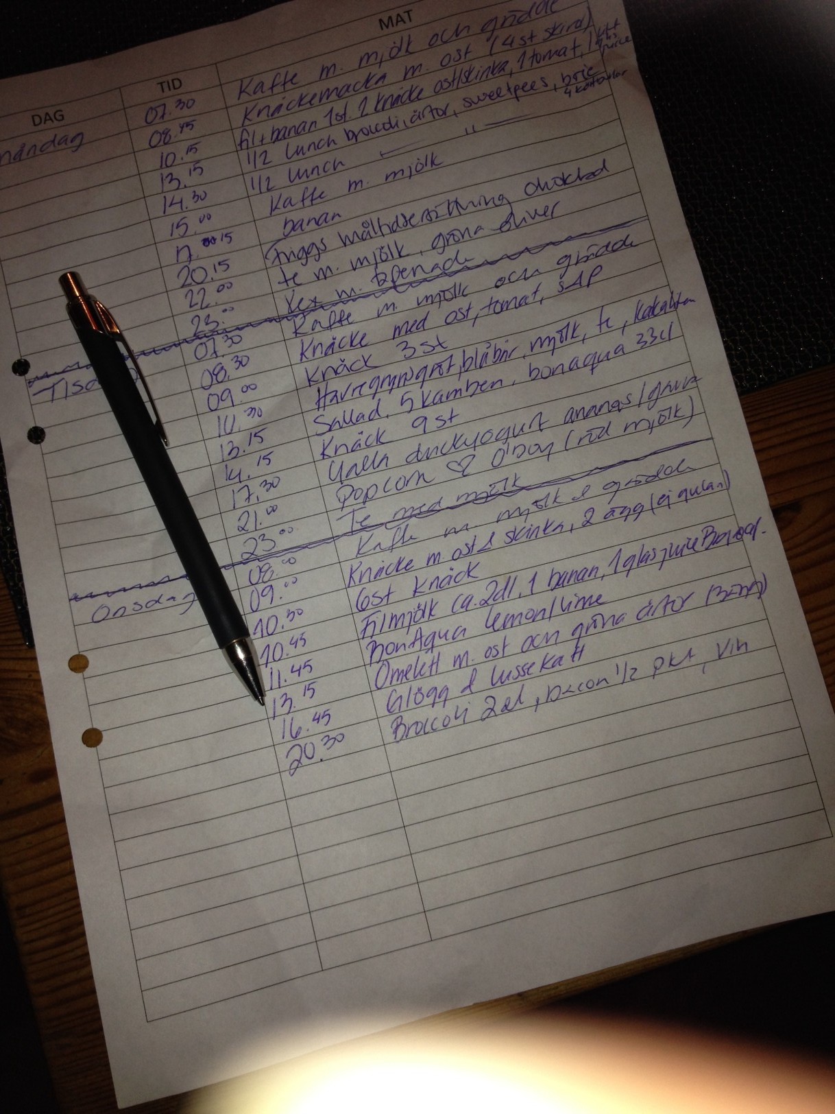 Jag har börjat skriva matdagbok 🙂 har ni gjort det någon gång? Man tänker sig lite för vad man äter! Jag gör det för att jag måste äta regelbundet, känner att magen börjar spåra ur 🙁 INTE BRA! Plus att jag måste se vart suget kommer ifrån, och hittills har jag kommit fram till att det är när frukosten blir för sen och när lunchen blir rubbad… Måste äta mer frukt också… Förut åt jag morot under dagarna, ska nog börja med det igen, och mer fett!!
