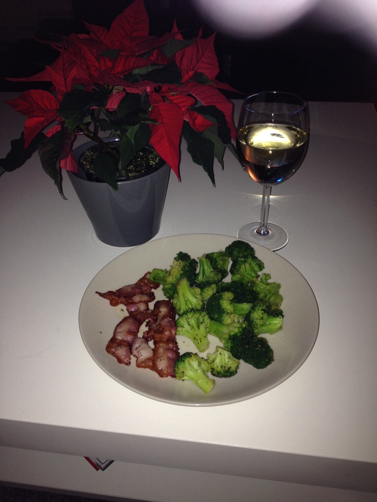 Middagen idag; broccoli och bacon. Lill-lördag så det blev ett glas vin också! NU – popcorn och PH!