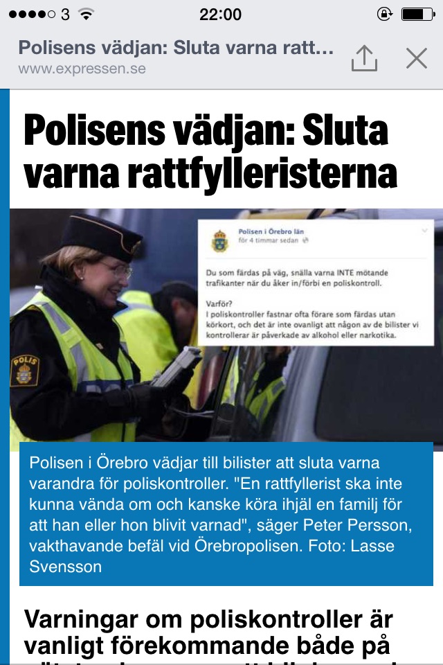 För jag tycker verkligen att det är SKITdåligt! Man skall inte köra full eller påverkad, men poliskontroller handlar om så mycket mer än det. Det kan vara någon som färdas i en stulen bil, någon som är efterlyst, någon som begått ett inbrott och mycket, mycket mer. Många vardagsbrott uppdagas vid rutinkontroller och jag tycker att vi skall låta Polisen sköta sitt jobb, för det är det dom gör. Du vill nog gärna själv ha hjälp när du haft inbrott, och det skulle inte vara så roligt att veta att du kunde fått tillbaka alla dina grejer om gärningsmannen bara fastnat i en rutinkontroll och brottet blivit uppdagat – men – tack vare någon som ”ville vara snäll” fick dom nys om kontrollen och valde en annan väg… och kom undan…