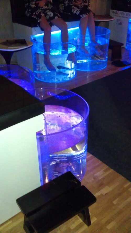 Ännu en överaskning var att få prova Fiskspa, känns helt absurt att stoppa ner fötterna i dessa små akvarium och låta fiskarna äta på mina fötter. Shit!  Dock hade dom inte så mycket jobb med mina fötter då jag var på pedikyr i Fredags. Men fötterna blev ännu finare med fiskarnas hjälp….:)