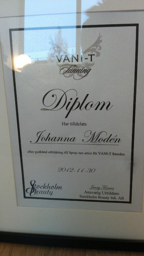 Då har jag varit på lyxdag hos Johanna Moden som gör min ögonfransar längre och mycket snyggare. Johanna har en mysig nyöppnad lokal i Södertälje men kör också ett par dagar i veckan inne i stan. Det är alltid lika mysigt att komma till Johanna och bli ompysslad, denna gång började vi spåna på ett riktigt roligt koncept som vi hoppas kunna göra verklighet utav:) Jag fick även prova på spraytan och på 3 minuter så fick jag en fin solbränna ( motsvarande 2 sköna veckor på Kanarieöarna:) Denna fär sitter i ca en vecka och gjordes inför en stor fest som går av stapeln nu på Lördag.