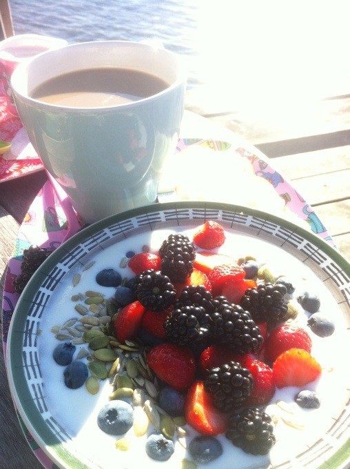 Oj oj, ännu en fantastisk helg med näst intill sommarvärme:) Åh jag njuter verkligen av varje stund i solen och det blev både kvälls och morgondopp på Kobben. Inte alla år man kan avnjuta frukost på bryggan i mitten på September 🙂 Dessutom hade våra underbara björnbär växt till sig och vi skördade årets första till frukosten, mums!