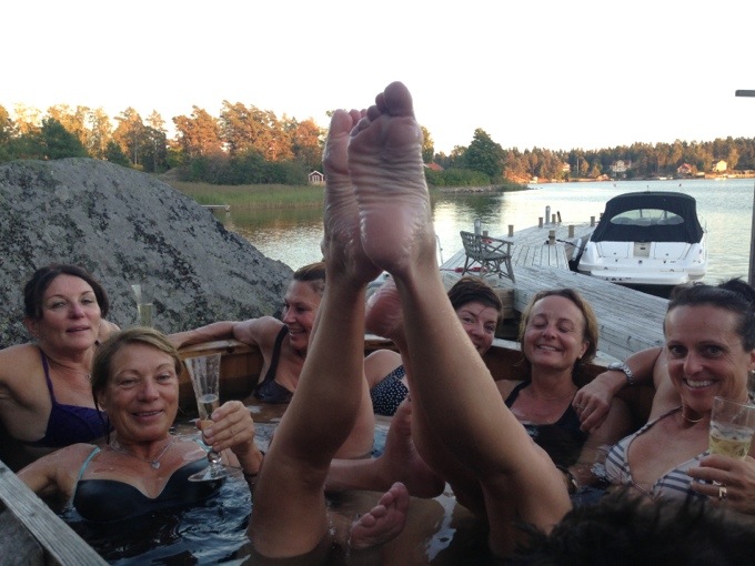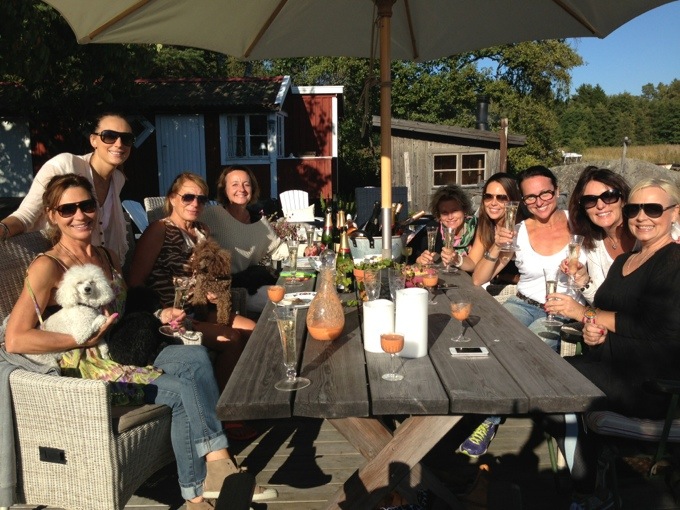Catherine är en riktigt hejjare på att fixa party och då hon även har en fingerkänsla för inredning så är allt så vackert och smakfullt lyxigt, att solen strålade gjorde ju inte denna dag sämre direkt. Vi var ett riktigt skönt gäng flickor och som alltid blev det snatter och vindrickande till långt in på småtimmarna. Vi njöt verkligen av varandras sällskap, mysigt badtunnebad,svalkande dopp i det blå, champange, snittar, god mat och härliga garv…….
