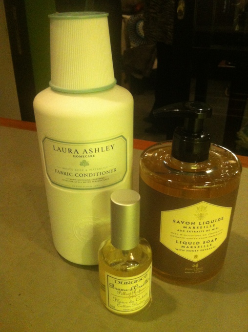 Blev en ny pumptvål till toaletten, pillowspray ( underbart med ett litet spray på kuddarna när man bäddat: ) och ett fantastiskt sköljmedel från Laura Ashley ( kommer endast att användas till mina kläder;)