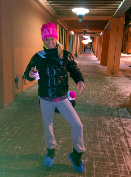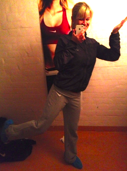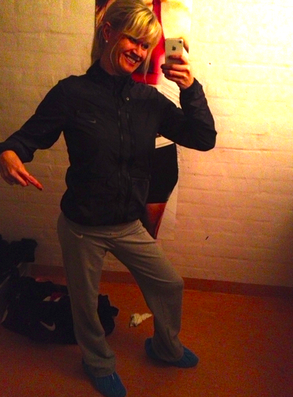 Häpp! Bild nedan på SATS Nacka Strand i vintras. Kom en bit innan jag hörde hur det prasslade när jag gick! Jag har för tusan samma byxor också ser jag nu! hahaha! Ja, grått passar ju bra till blått! 🙂