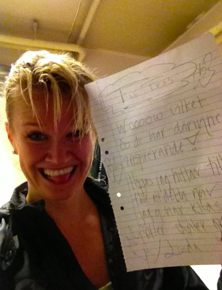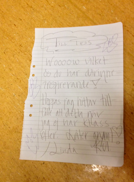 Efter att ha kört min cykelklass som jag alltid gör på tisdagarna på SATS Fridhemsplan, och kommer in i personalomklädningsrummet, möts jag av en lapp på golvet. Det första jag ser när jag kliver in. Lappen hade Linda min vän och kollega som kör klassen efter mig, skrivit och lagt fram! Gissa om jag vart glad när jag såg den! 🙂