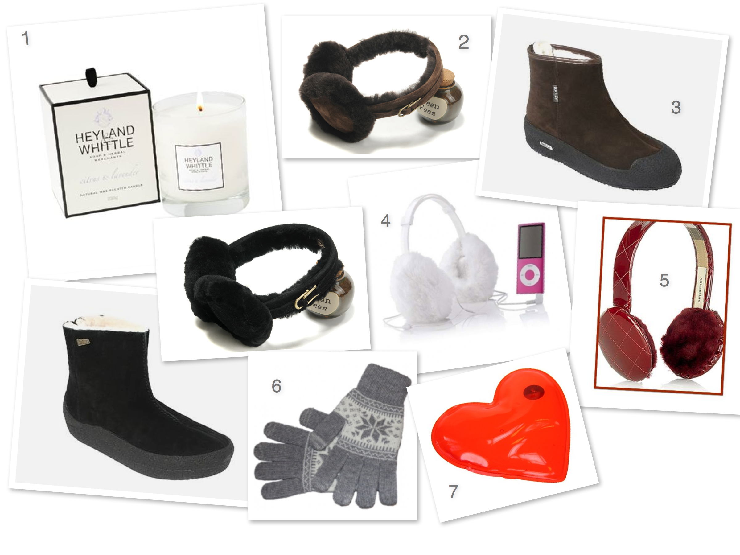 1. Doftljus! 2. UGGS Öronmuffar 3. BALLY kängor 4. Öronmuffar med inbyggda hörlurar 5. Burberry Öronmuffar 6. Vantar till touchskärmar 7. Värmande hjärta – Favorit!