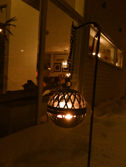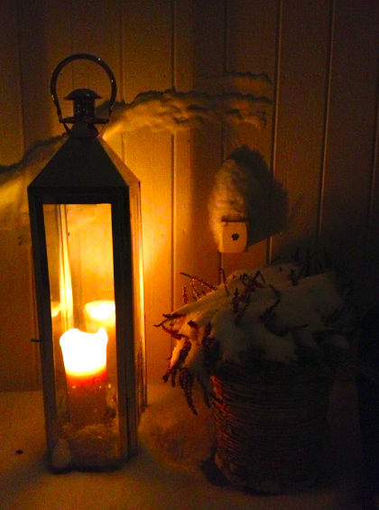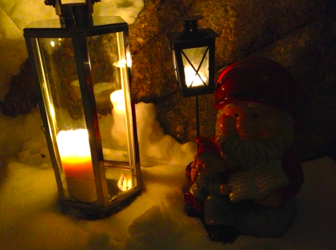 Jag älskar att gå runt huset och tända mina små lyktor. Det är fint när det lyser, visar att nån är hemma och blir så stämningsfullt i snön. Tomten åkte fram idag med som jag tidigare har haft på min balkong på Kungsholmen! Nu står han här. 🙂