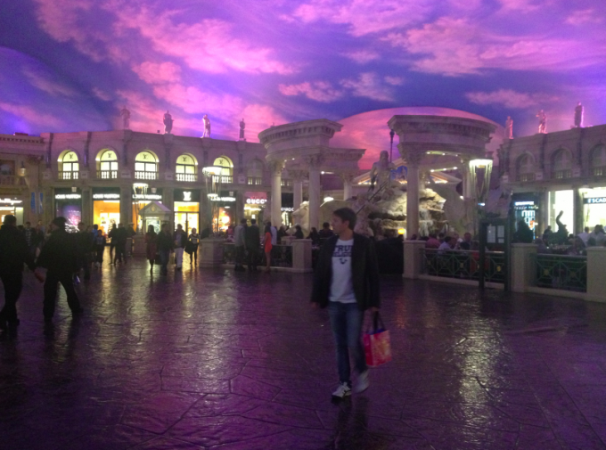 En annan favorit är Ceasar Palace som är uppbyggt som Rom med enorma Fontana Di Trevi i mitten och vacker blå himmel över dig så tiden glömmer du helt. Här är butikerna öppna till 23 så du kan i lugn och ro gå och strosa och njuta, av att nästan vara i Rom också! 🙂