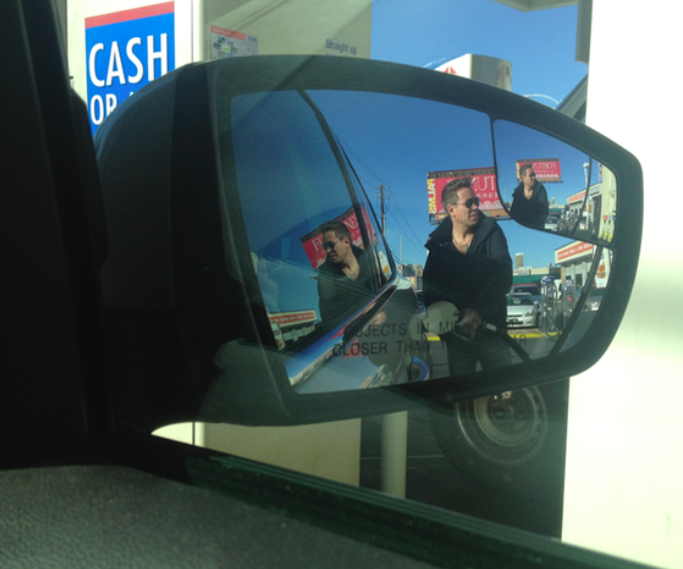Min underbara man, alltid glad! Christer vet inte att jag sitter och tittar på honom när han står där och tankar och att jag tar fotot, för jag börjar själv att le, när jag ser Christer i spegeln, bara stå där och le, i solen. Christer ler oftast, alltid glad, en sida som jag älskar. Han är fin, han är min, min man. 🙂