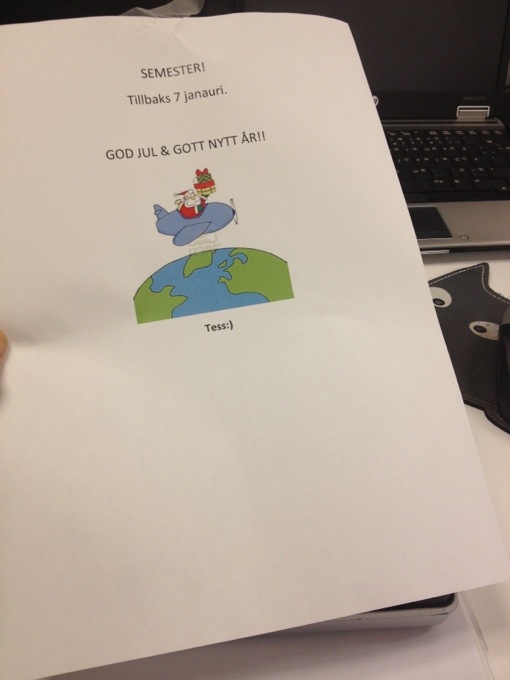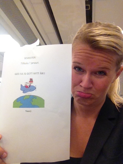 Åh! Kommer så väl ihåg känslan när jag satte upp den här lappen. Sätter alltid upp en lapp på min skärm på jobbet när jag åker iväg, så ser folk när man är tillbaks. Nu är jag tillbaks, gick alldeles för snabbt och tar motvilligt ner den. Alltid lite jobbigt första dagen även om jag har ett jobb jag trivs med. Det är väl omställningen, tillbaks till ”vardagen”. Och kolsvart och minusgrader för att tillägga! Jag tar fram min kontorslampa och drömmer mig tillbaks till den kaliforniska värmen! 🙂