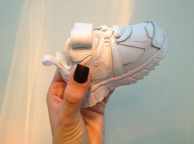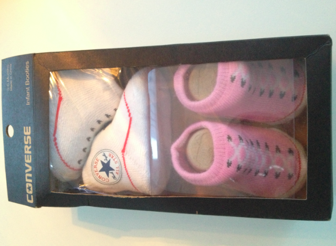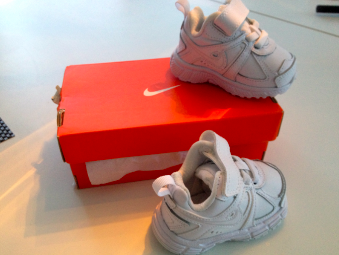 Nä, jag köpte NIKES till min vän Stinas fina lilla Juni 4 månader. Klart Juni ska ha ett par NIKES! För sina första steg! Och fram tills den dagen hon kan gå så får hon ha strumporna som är gjorda som små Converse! Vita och rosa så klart! 🙂