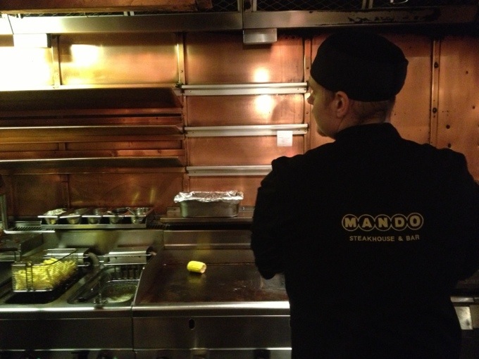 Det fina här och att det var så kul att jobba här var att köket är uppe i baren, så du sprang och beställde allt direkt till kockarna, framför gästerna. På den tiden, på den tiden?? Låter som jag är 100 år, haha, men då var Restaurang Mandos unika grej att serveringen, servetriserna fick inte ha penna och papper utan vi skulle ha alla beställningar i huvudet och beställde muntligt hela tiden till kockarna i grillen, Kan ni tänka er en lönefredag, rusningstid, full restaurang och vi hade allt i huvudet, och beställde direkt till kockarna, från ett 8 manna bord tex! Det blev ett jäkla tempo och folk satte sig i baren alltid bara för att höra oss, det blev likt underhållning och riktigt kul stämning när det var som stressigast. Sen skulle du hålla allt det där i huvudet tills gästerna skulle betala, då fick du slå in allt i kassan! Man blev förvånad hur mycket man kom ihåg. Glömde kanske någon extra lökring ibland men man kom faktiskt ihåg allt. Jätte kul! Och att vi gick på provision också på den tiden. Vi var alltid ett team om två servitriser, två kockar. Vår lön var 10% på försäljningen efter passet, flat, rakt av. Och tror ni man sprang lite extra då och höll ett jäkla tempo och verkligen jobbade som ett team. Unikt för en restaurang därför tror jag att jag trivdes så bra också och på en ständigt full restaurang som Mando alltid var så fick jag känna på att tjäna riktigt bra med pengar direkt efter skolan. Aldrig tror jag ett servetrisarbete var så välbetalt som då. Tyvärr är reglerna ändrade nu. Det var tider det! 🙂