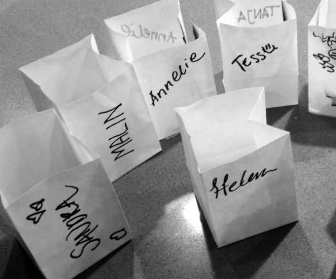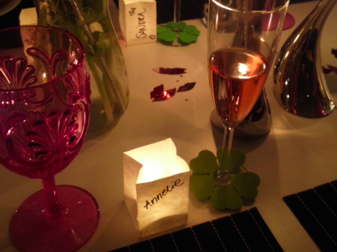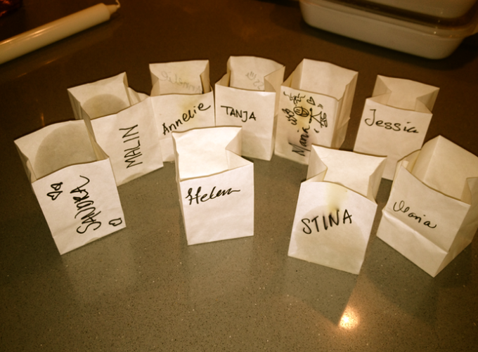 Annelie kom med riktigt fina ljuslyktor till middagen i fredags som jag vill tipsa om. Lyktor du skriver ditt namn på och har som bordsplacering och sen sätter du i ett värmeljus som lyser upp. Enkelt men väldigt vackert. Tjejerna fick skriva sitt eget namn och sätta sin lykta där dom ville sitta.
