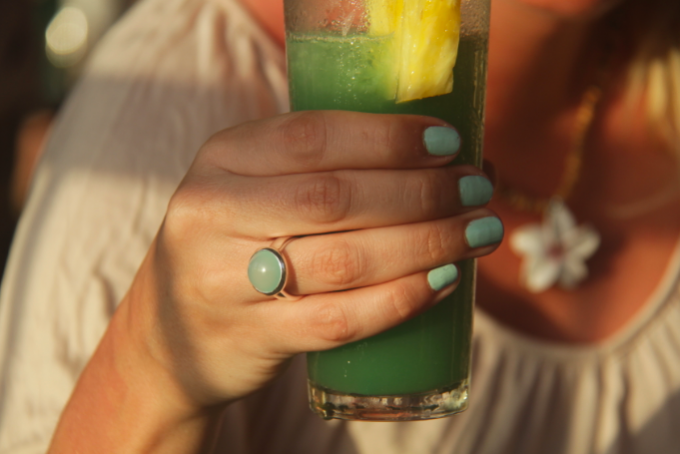 Jag kallar den ”min semesterring”! 🙂 Ringen jag köpte innan vi åkte ner hit som jag så flitigt har använt. ”Semesterring” då jag fastnade för den blå/turkosa fina färgen och smycken med färg tycker jag är så snyggt till sommaren och tänkte den skulle passa här. Ikväll med turkost lack och en Carribean Blue drink! Jo då! Gäller att matcha! 😉