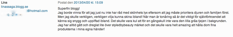 Ett STORT GRATTIS till Lina som fångade mig med sina rader och jag hoppas du nu hittar något extra fint till dig själv på styledbybeauty.se! GRATTIS Lina, jag mailar dig koden inom kort så du kan shoppa loss! 🙂 Fin blogg också! Linas blogg hittar du HÄR!