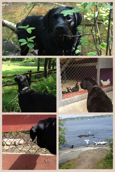 Idag kom mina kompisar Maria och Nelson. Vi tog en söndagspromenad i Nyckelviken där Nelson aldrig tidigare har varit. Och vilket äventyr! Idag har Nelson sett får för första gången. Dom tyckte han såg lite roliga ut och höns men hönsen blev Nelson lite rädd för, dom luktade inge vidare och såg elaka ut. Grisarna var roligare men roligaste var svanarna tyckte Nelson när han sprang ner och skrämde dom i vattnet. Hehehe! Så det blev några dopp i havet och sjöarna! Märks inte alls att Nelson är en labbe! 🙂