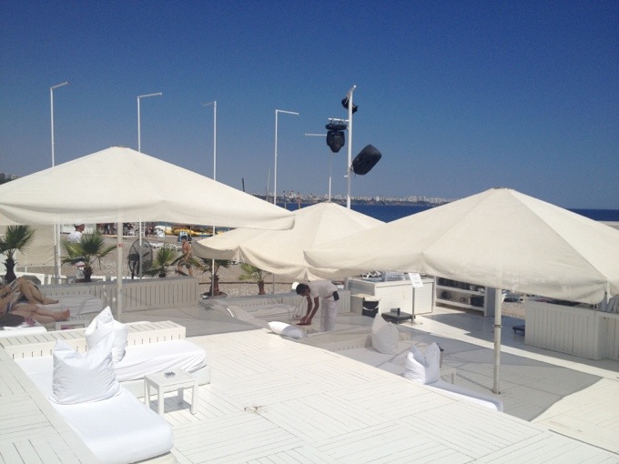 Lördag. Älskar hotellets Beach Bar! Jag som älskar inredning med mycket vitt och stilrena detaljer trivs riktigt bra här! Det med god mat, chill musik, bra service och ingen trängsel direkt. Allt här är i väldigt skönt mood och du kan ligga och äta om så under fläktar och parasoll. Idag är det extra varmt, +36C! Puh! 🙂