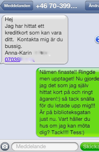 Men lyssna här då! I morse hade jag frukostmöte med min vän Malin. Samtidigt som jag parkerar bilen och betalar parkeringen så pratar jag i telefon. Kutar vidare och sätter mig på restaurangen och påbörjar nytt samtal tills Malin kommer, när jag plötsligt under samtalet ser att mitt kort saknas i mitt iPhonefodral och börjar precis leta och får då ett sms, under pågående samtal. ”Hej jag har hittat ett kreditkort som kan vara ditt…
