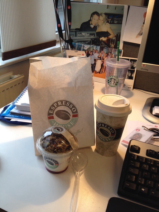 Har blivit frukost från Espresso House som jag stannat till vid på vägen till jobbet några mornarna nu. Skyller på att jag har varit gräsänka i veckan, inge kul att äta själv. Men! I kväll kommer min man hem! WIII! Har längtat!
