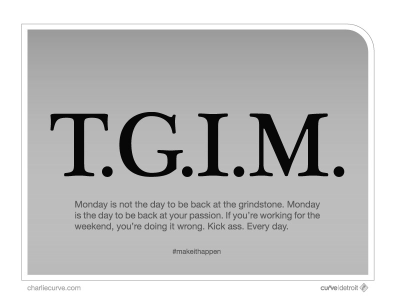 Jag säger TGIM! Ryck upp dig. Livet är för kort för att gå och släpa fötterna efter sig. Gör nu det du alltid har velat. Tro på dig själv. Find your passion!
