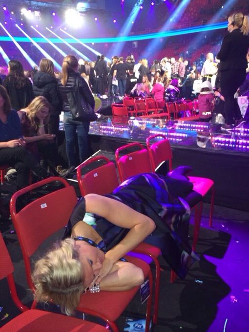 Konfetti, skumpa, folkhav runt Kevin! Sändningen var över! Tess – en utarbetad kommersiell Projektledare la sig på stolarna och andades ut, och somnade, när vinnaren firades där bakom någonstans på scen.. – Ursäkta – skulle ni kunna dämpa er lite och skruva ner musiken bara! Jag försöker vila lite här! 🙂