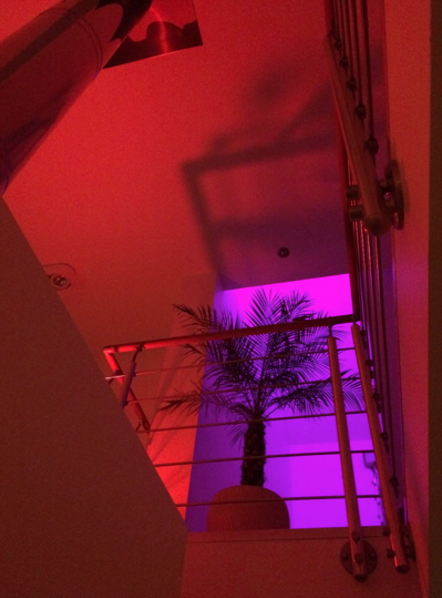 Rött, grönt, blått, det lyser i hela vårt hus nu! Min man är barnsligt förtjust i teknikprylar, framförallt allt som går att styra med iphonen. Och som går att koppla till musik. Han fick hem en beställning nu, på lampor, som du har 16 miljoner färgval på. Jo, det är sant. Då du styr det från din iPhone eller padda. Må låta galet, men han har en genuin känsla också och satt dom jäkligt coolt. En på andra våningen och sitter nu och styr den här nerifrån. Eftersom du kan få precis vilken färg du vill så kan det vara ”vanligt” ljus på med men sen få jäkligt coola effekter anpassat till stämning. Vi som älskar att anordna fester kommer ju ha galet coolt ljus här hemma nästa party! Då jäklar! Vi har ju ett nyår vi ska ta igen som vi ska fira då ni! Då ska huset lysa, med clubmusik, på alla våningar, då Christer självklart har kopplat det i hela huset med, i alla rum, och ja, styr så klart med sin iPhone. Är man gift med en DJ, som mixat guldskivor till Paula Abdul, bott i L.A och har radio som sitt jobb och passion, då bor man i ett musiknäste! Welcome to Modigs Crib! unch unch unch! 🙂