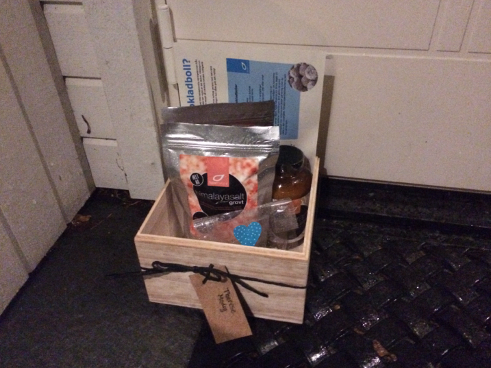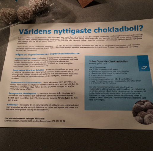 Hallå ja! 🙂 Fredagen bjöd på fler överraskningar som jag måste visa! När jag kom hem igår efter jobbet stod den här lilla låda utanför dörren och väntade! Vad överraskad jag blev när jag knatade upp i snöblandat ösregn upp till huset och såg den här lilla lådan. Vilken fin gest! Ett kitt från Supernature. Där stod jag i regn och mörker och bara log. Nu snackar vi PR som verkligen fångade Tess intresse för i lådan var det världens kanske nyttigaste chokladboll! En chokladboll man tydligen kan äta med gott samvete och receptet var med från hälsogurun John Opsahl som skrivit boken ”Supermat – läkande mat från naturens hjärta” Det här måste jag prova för chokladbollarna som också fanns med var verkligen jätte goda, jag slukade två på en gång! 🙂