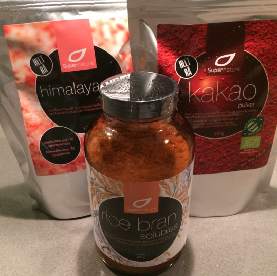 Rice Bran Solubles som man kan blanda i juice, vatten, smoothies eller på gröten, proppat med näringsämnen och vitaminer. Himalayasalt och kakaopulver.