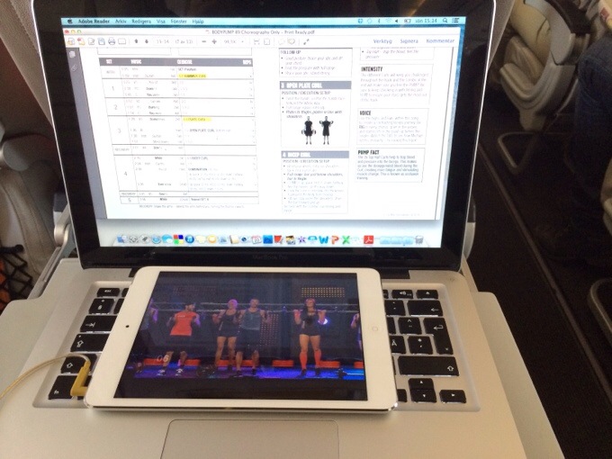 Nu snackar vi multitask! Koreografin på datorn, filmen – nya realesen Body Pump på iPaden, nöter nya programmet som jag kör imorgon. Den är bra! Grymt bra!