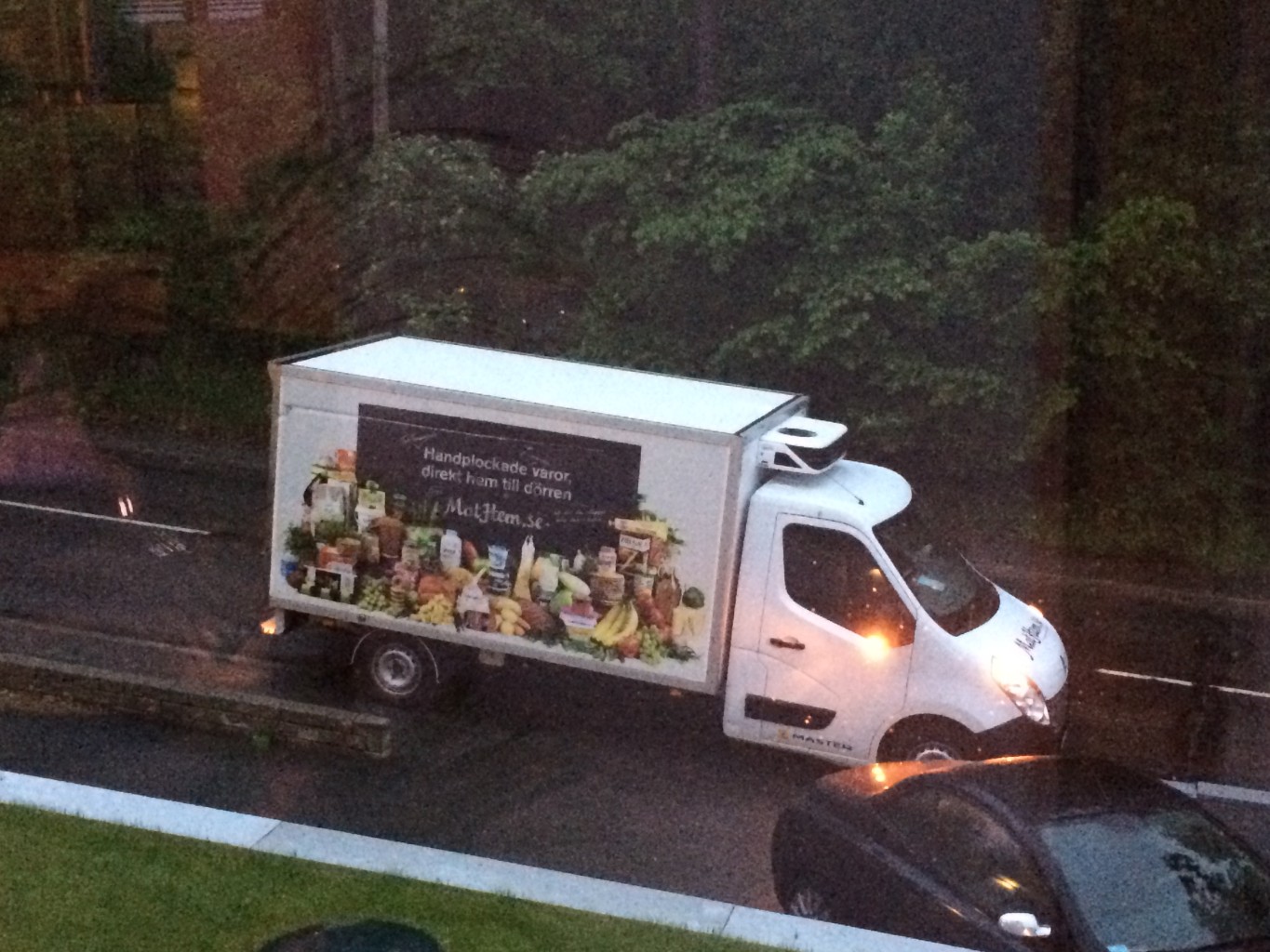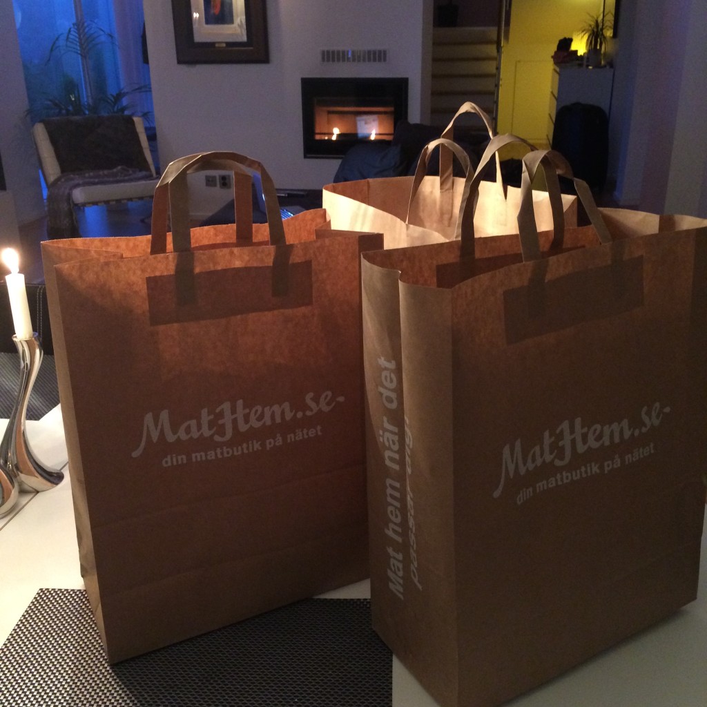På utsatt tid jag valt, precis som smset angivit, kom dom glidandes in på vår gata och ringde på vår dörr med matkassarna snyggt packade utanför. Nämen VÄLKOMMEN MatHem!! Glad to see you! Känner mig nästan som en Hollywood Fru eller nåt. Kul och väldigt lyxig känsla. Modern känsla på nåt sätt. Love it! 🙂