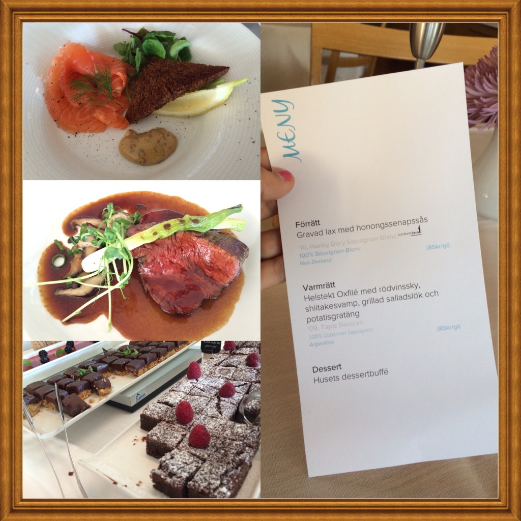 Tre rätters och efterrätterna, observera plural, då det var ett helt bord uppdukat med ostar, hemmabakad rabarberpaj, glass, crème brulé, kladdkaka, choklasmousse, ALLA mina favoriter!! Jösses! Tur man skulle springa loppet dagen efter! 🙂