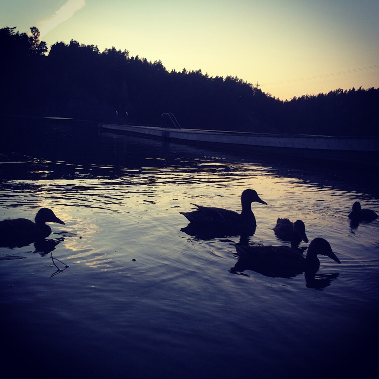 Vid sjön, andfamiljen simmandes förbi i solnedgång.
