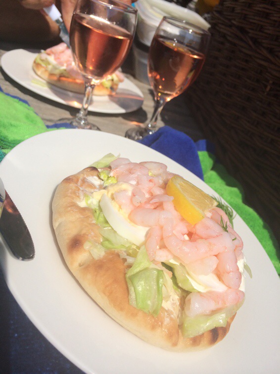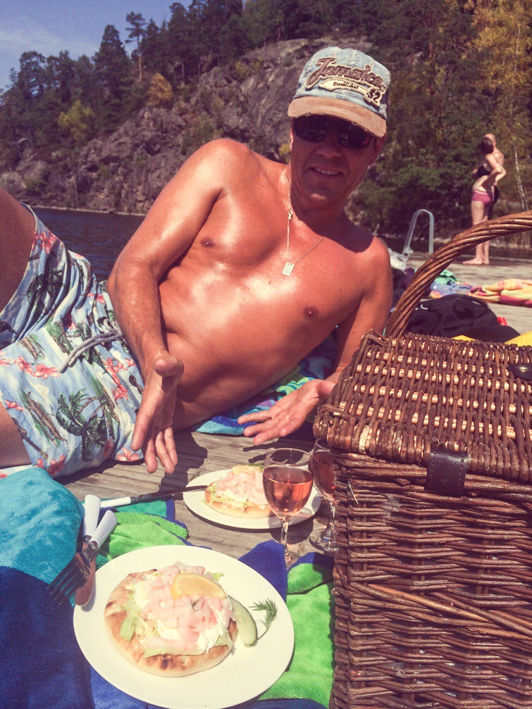 Och så kommer han! Min man! Och alltid överraskar!! Med en fullpackad picknickkorg, med räkmacka, melon, rosévin (low carbs,lower alcohol!;) Christer bara är för bäst! Det blev lunch på bryggan! 🙂