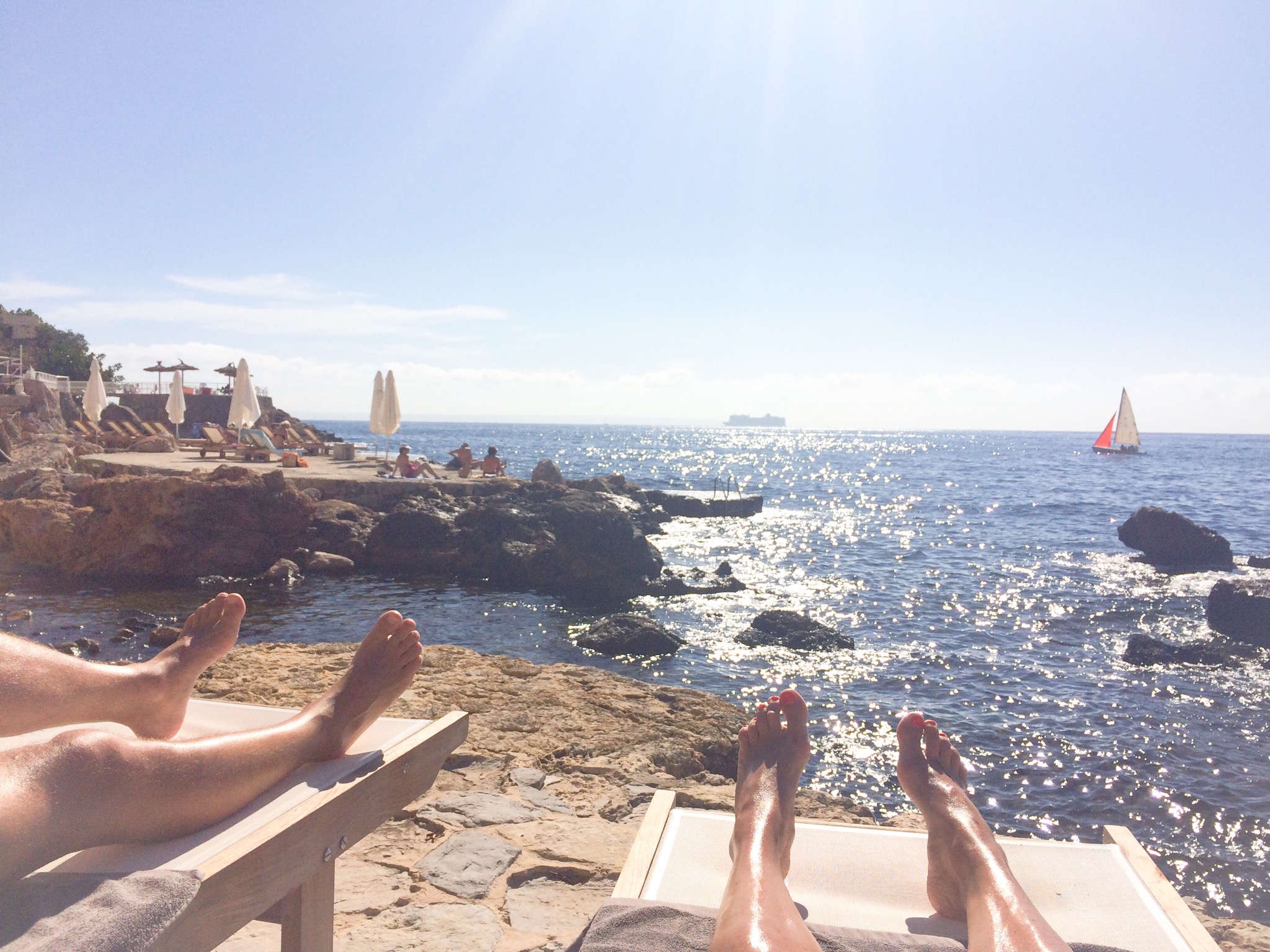 Vi är inte svårövertalad när det kommer tips och rekommendationer som låter bra och i vår smak. Hotellet tipsade om en beach club inte långt härifrån, i Cala Mayor så den tog vi direkt vår andra dag här då det skulle bli 31 grader strålande sol. Perfekt stranddag och vilken himla tur med vädret vi har den här helgen! Tack Palma som visar sig från sin bästa sida!