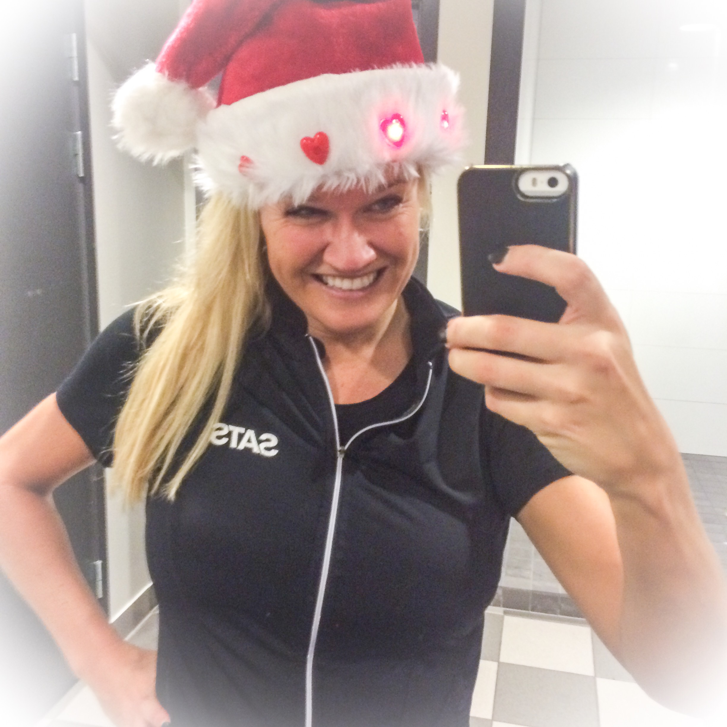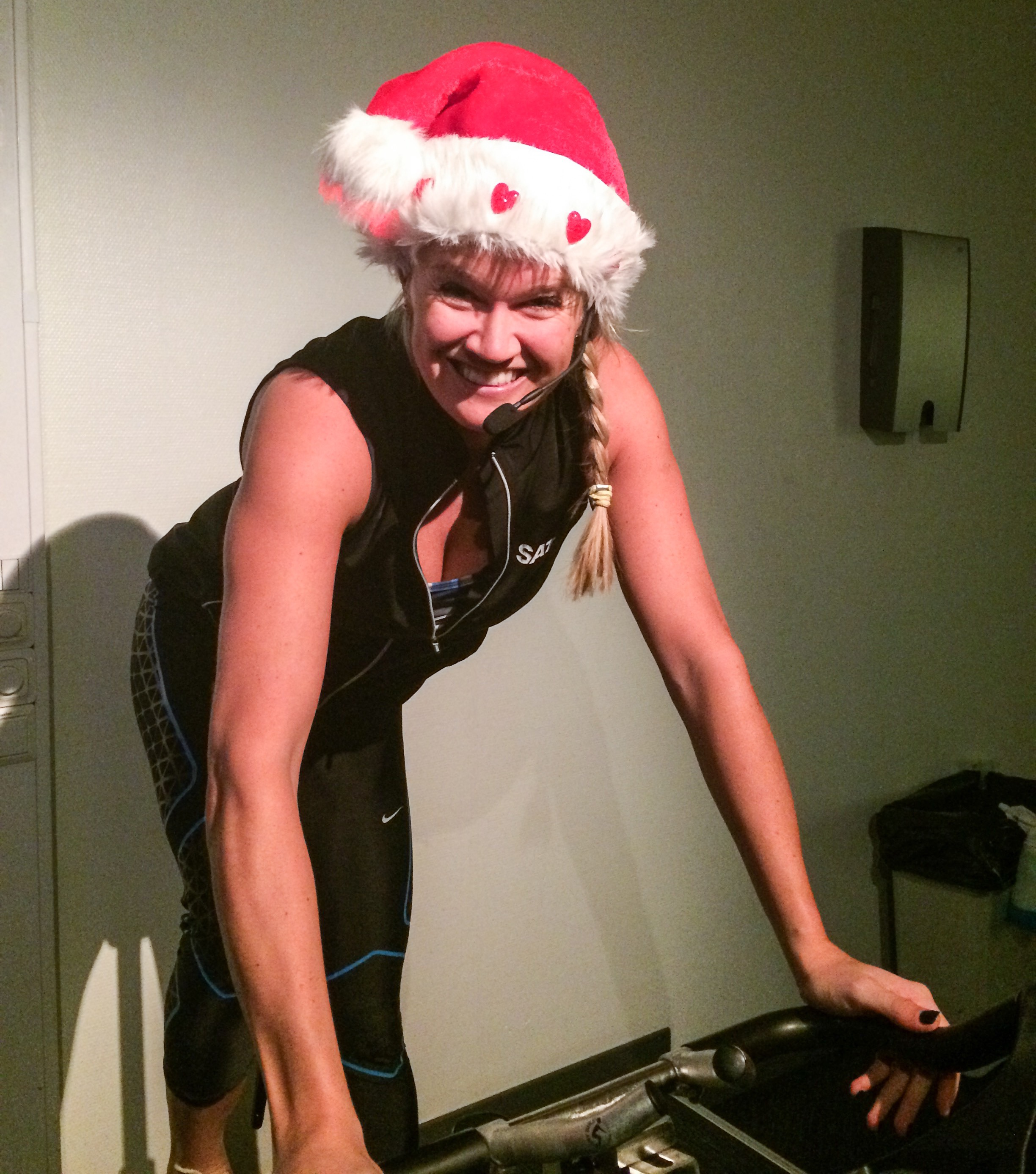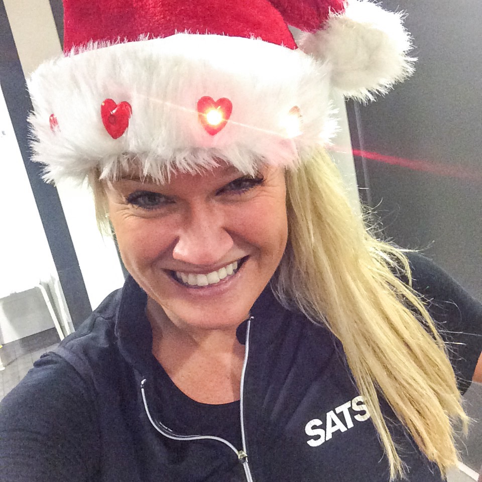 Sista passet för i år, som jag instruerar, självklart med den årliga, blinkande tomteluvan på! Resten av träningen i år blir på Cubas vita stränder!